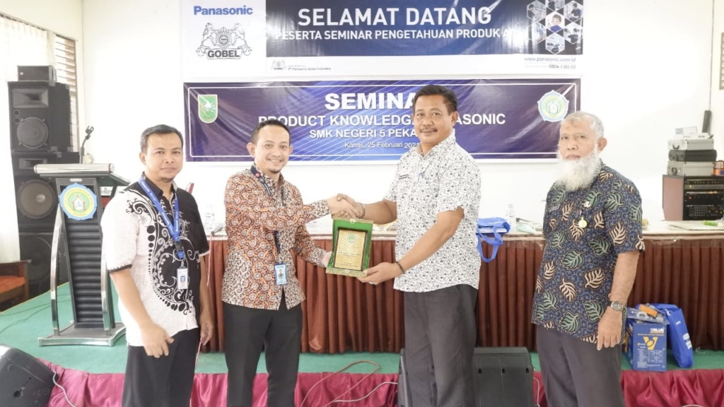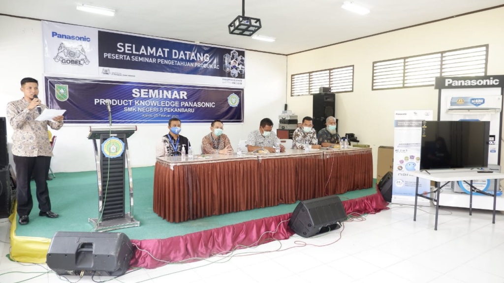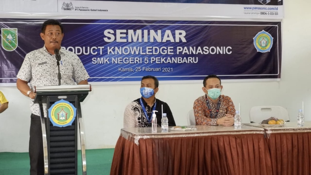 SMK Negeri 5 Pekanbaru.sch.id – PT. Panasonic Gobel Indonesia bersama SMK Negeri 5 Pekanbaru mengadakan kegiatan Seminar Pengetahuan seputar produk Panasonic di Aula SMK negeri 5 Pekanbaru, Kamis, 25 Februari 2021. Seminar yang mendatangkan Branch Manager Panasonic tersebut diikuti oleh 47 peserta didik yang berasal dari jurusan Teknik Audio video dan Teknik Pendingin Tata Udara. Kegiatan Seminar Product Knowledge Panasonic dibuka secara langsung oleh Kepala SMK Negeri 5 Pekanbaru, Drs. Dwi Bowo Sukmono, MM. Dalam kesempatan itu Kepala SMK Negeri 5 pekanbaru mengucapkan terimakasih kepada pihak PT. Panasonic Gobel Indonesia yang telah memilih SMK Negeri 5 pekanbaru sebagai tempat pelaksanaan kegiatan.